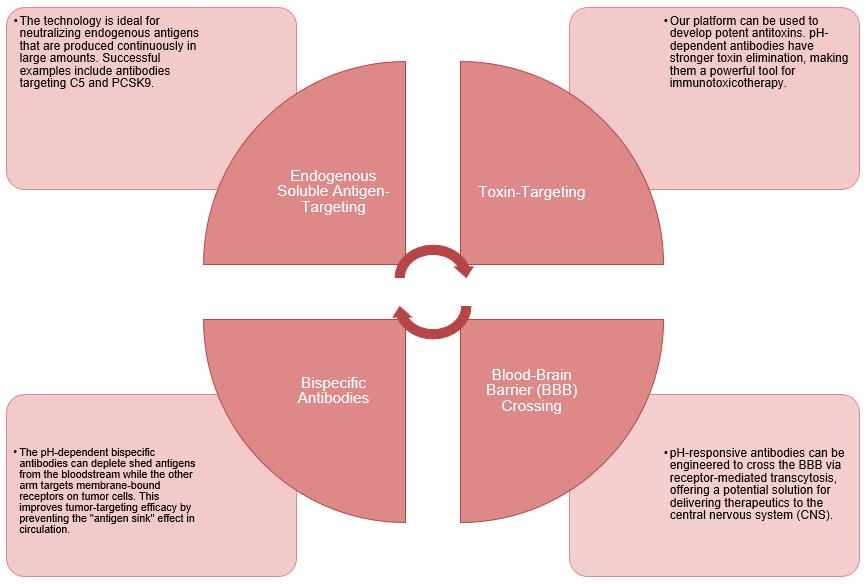 Our technology is particularly well-suited for soluble antigens that are highly abundant or produced continuously, such as cytokines, toxins, or circulating biomarkers. This is because our "catch and release" mechanism is optimized to handle high antigen loads and prevent drug-mediated accumulation.